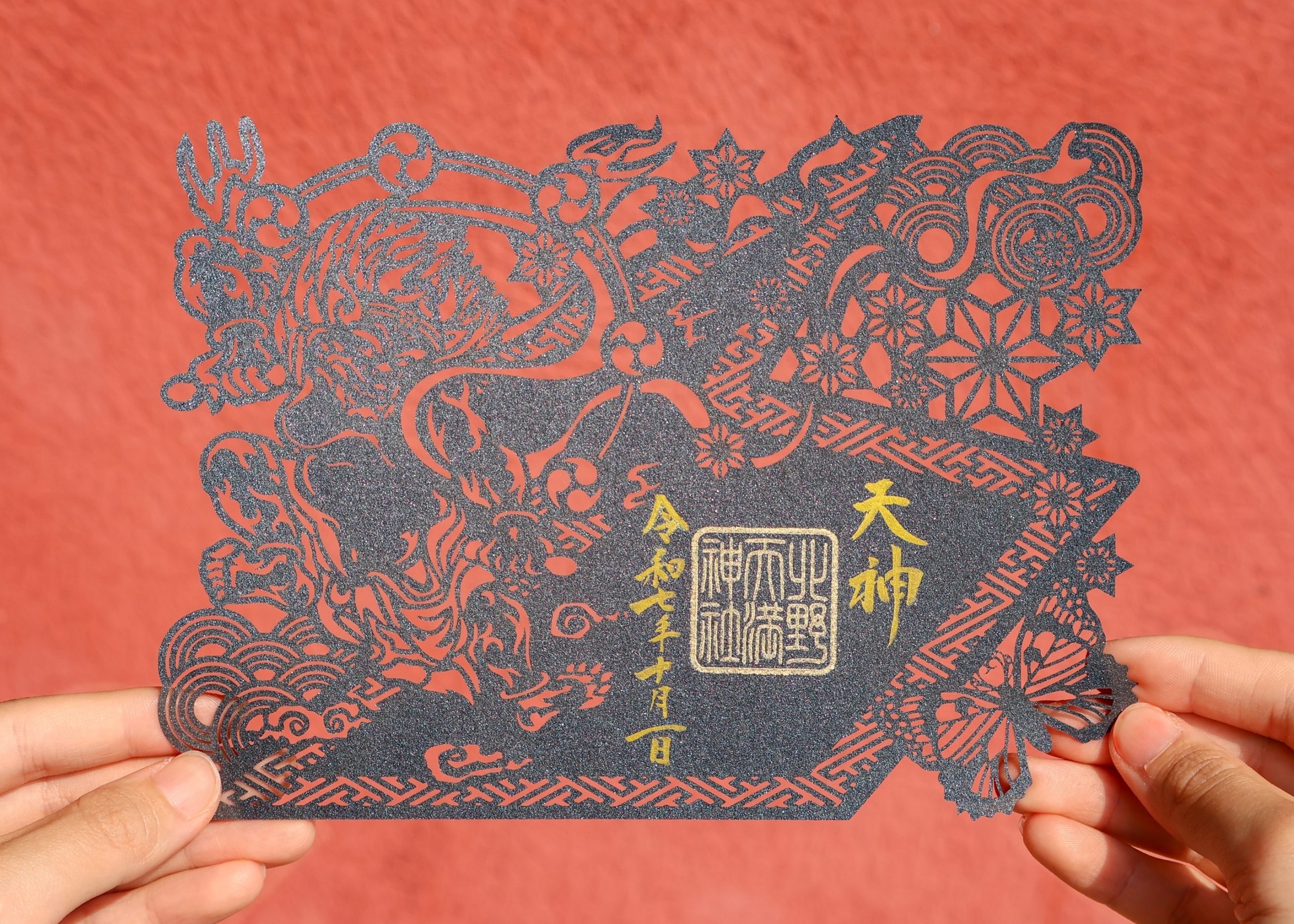 令和7年10月切り絵御朱印 【 火雷天神 】 菅原道真公は火雷天神(ほのいかづちのてんじん)と称され、雷の力への畏怖や、雨による恵みへの感謝はやがて実りを授ける神、農耕の神として広く全国に崇敬されていきました。 今月の切り絵御朱印は、五穀豊穣を願い『天神』と揮毫し奉製しております。