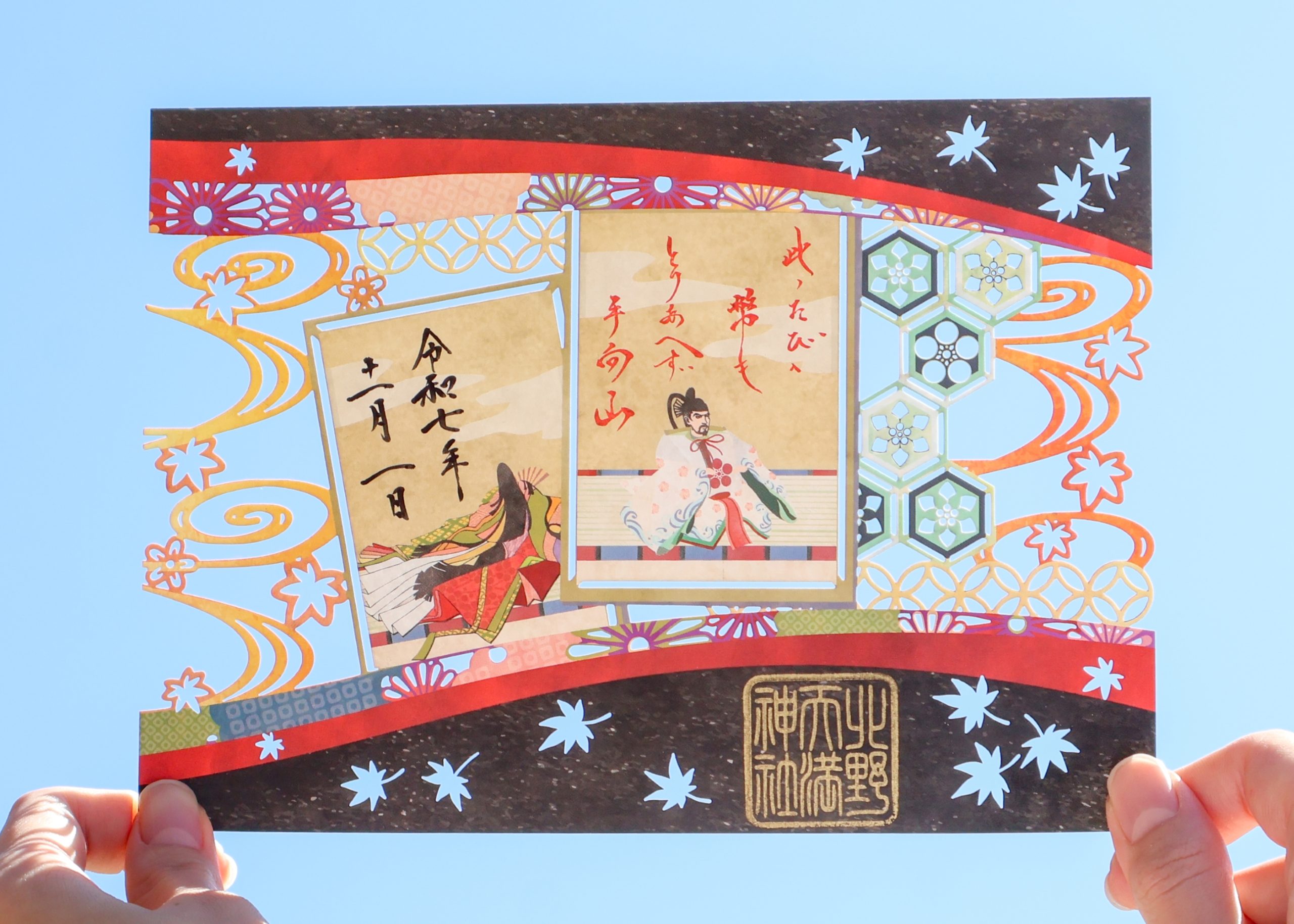 令和7年11月切り絵御朱印 【 紅葉錦 】 今月の切り絵御朱印は、宇多上皇の御幸に同行した際に菅公が見事な秋の情景を詠まれた和歌の上の句を百人一首の切り絵と共に配し、鮮やかにもみじが染まり秋の訪れを感じる神戸北野をお楽しみいただけますよう奉製しました。