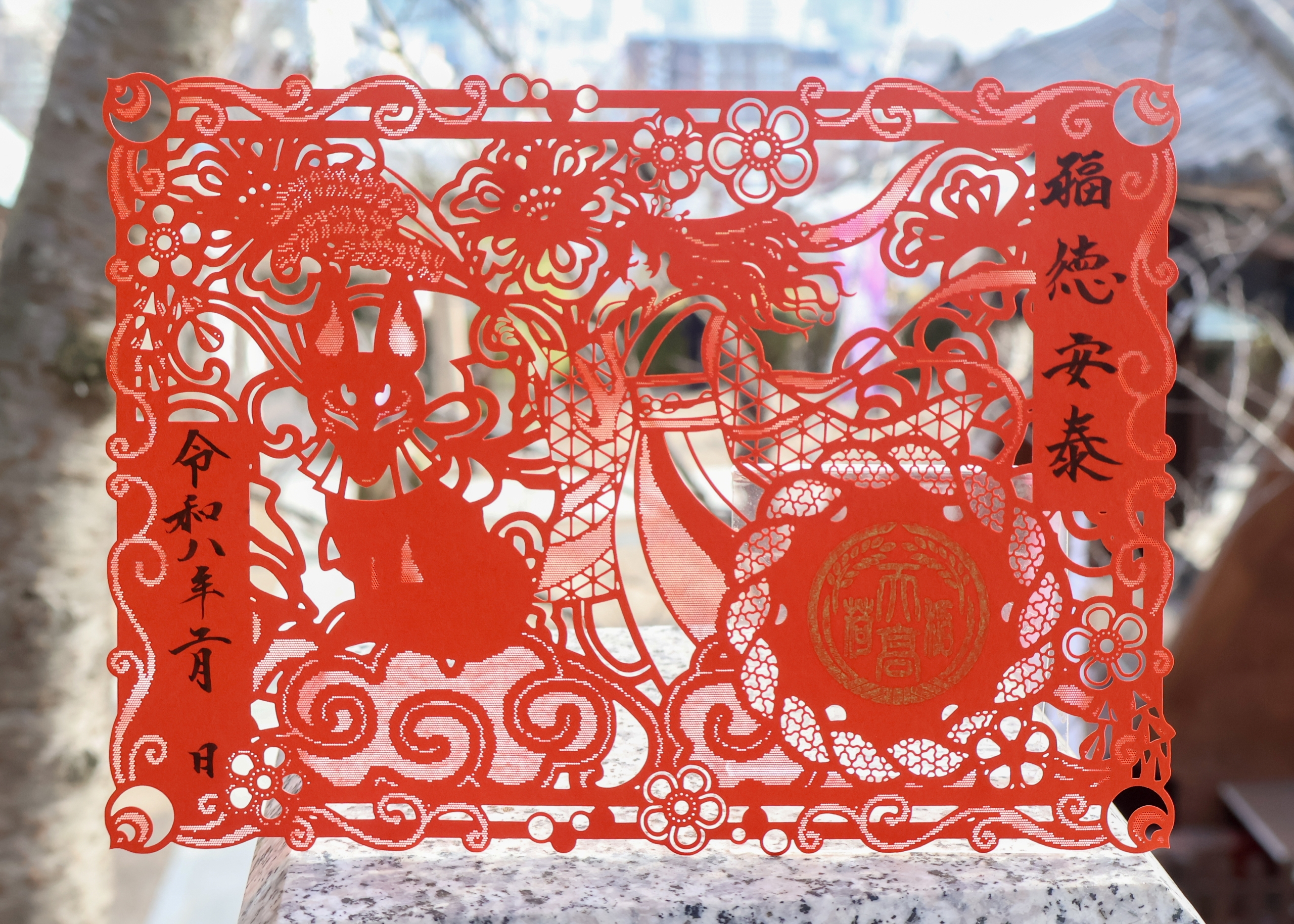 天髙稲荷神社 切り絵御朱印 五穀豊穣を司ることから、商売繁昌や家内安全、ひいては生活全般の幸福や利益をもたらす神様として信仰される宇迦之御魂神と神使であるキツネを表現し、日々の豊かな恵みが永久(とこしえ)の幸福につながりますよう福徳安泰と揮毫し奉製しております。(令和8年2月限定頒布)