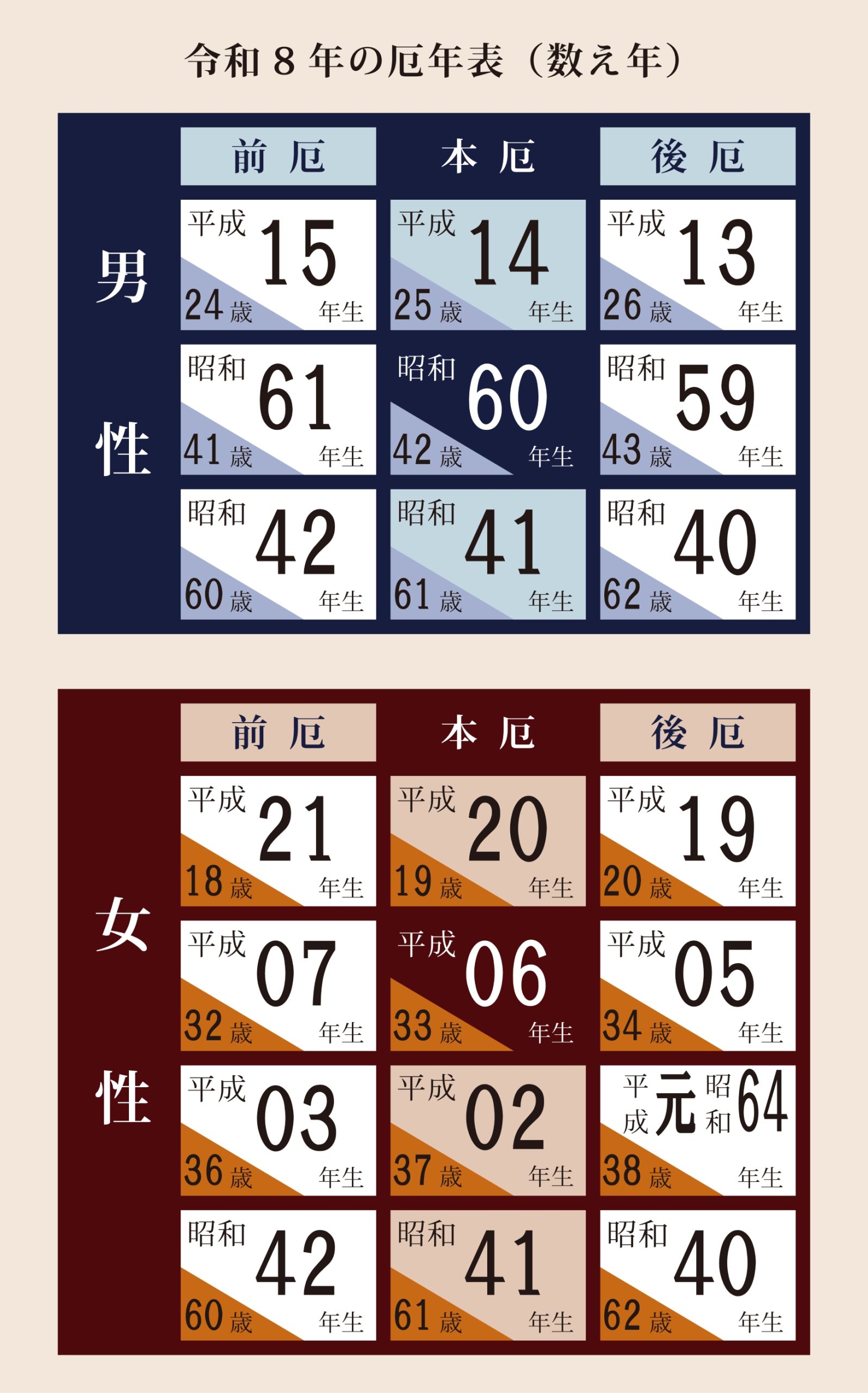 数え年で、男性は25・42・61 歳、女性は19・33・37・61 歳が「本厄」とされ、