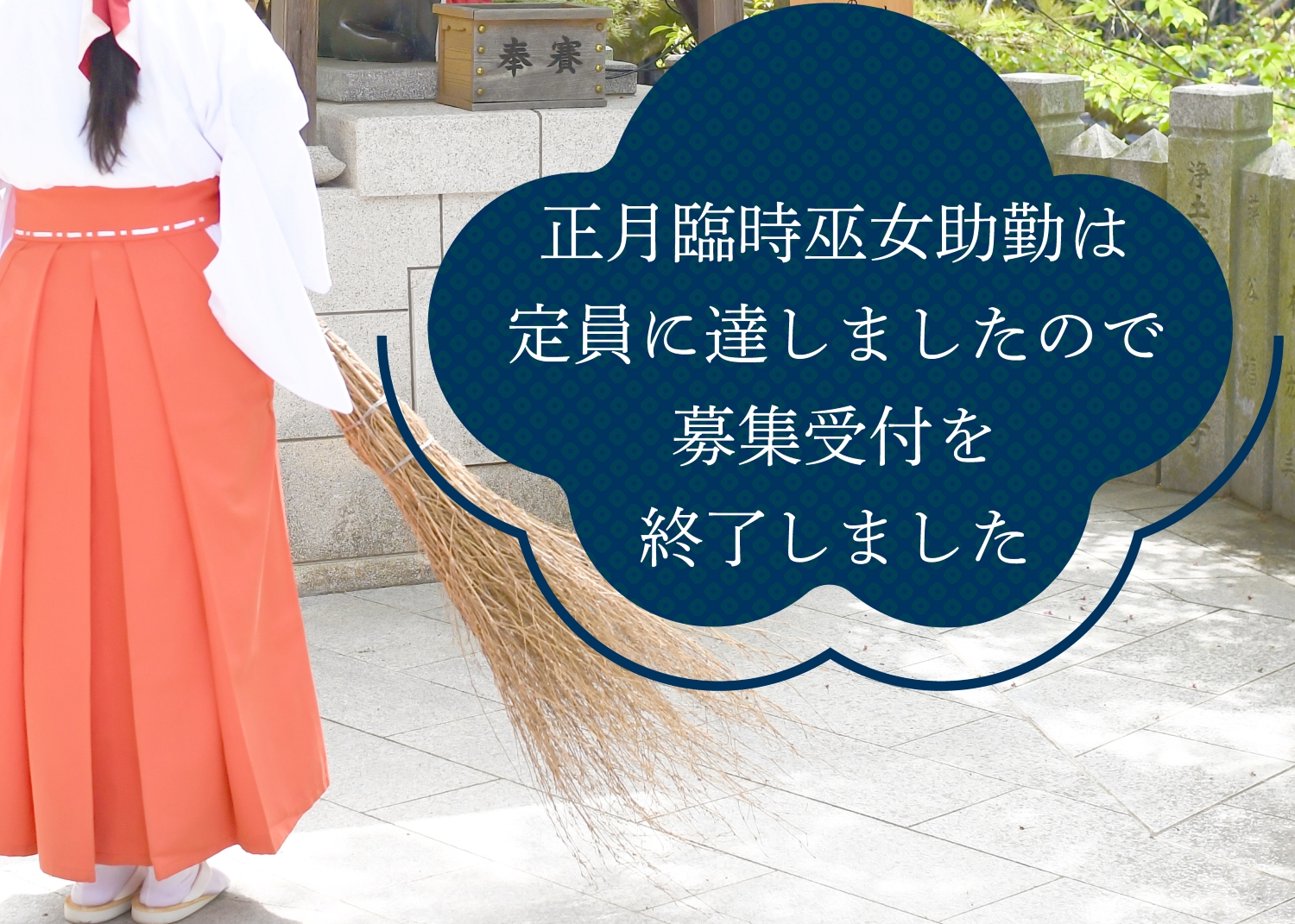 1. 大学生・専門学校生・社会人の方(高校生、既婚者は不可) 2. 年齢が18歳~26歳で、市内近郊在住であること 3. 明るく元気に神前奉仕できる方 4. 下記日程にご奉仕可能な方 一、旧年12月31日23時~8時頃/新年1月2日~1月3日の3日間 二、新年1月1日~1月3日の3日間  |